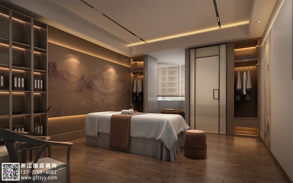**三、色彩体系的气韵流动** 不同于医院冰冷的纯白,中医馆主色调当如展开的古老药方。墙面采用矿物颜料调制的"松烟墨"色,这种从北宋《营造法式》复原的工艺,能使色彩随湿度产生细微变化。诊疗区选用浅赭石色营造安定感,理疗室则用靛蓝与月白渐变,暗合"阴平阳秘"的调理理念。某杭州医馆创新运用数字投影,在白色纱幔上实时呈现患者脉象对应的色彩波动,将抽象的中医诊断可视化。